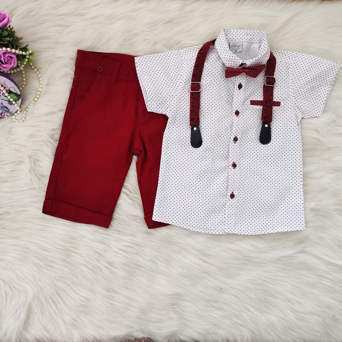 Compleu format din camasa cu maneca scurta , deschisa in nasturi pe partea din fata, , papion cu elastic , vesta , pantalonasi scurti elegant model cu buzunare ,bretele separate.