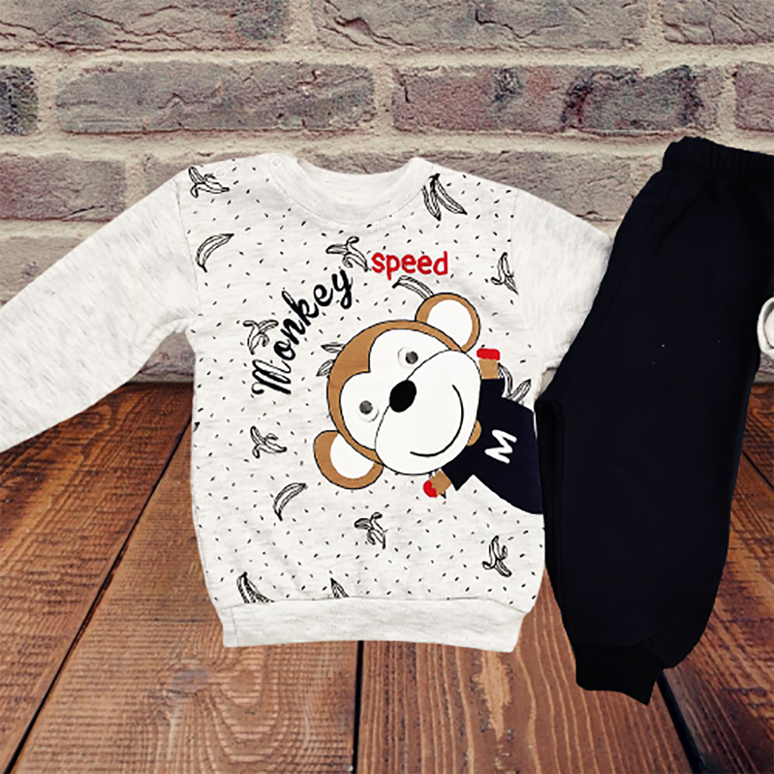 COMPLEU GRI MONKEY 3-18 LUNI FORMAT DIN BLUZA DE COLOARE GRI SI PANATALON NEGRU DIN BUMBAC MOALE FOARTE PLACUT LA ATINGERE .
