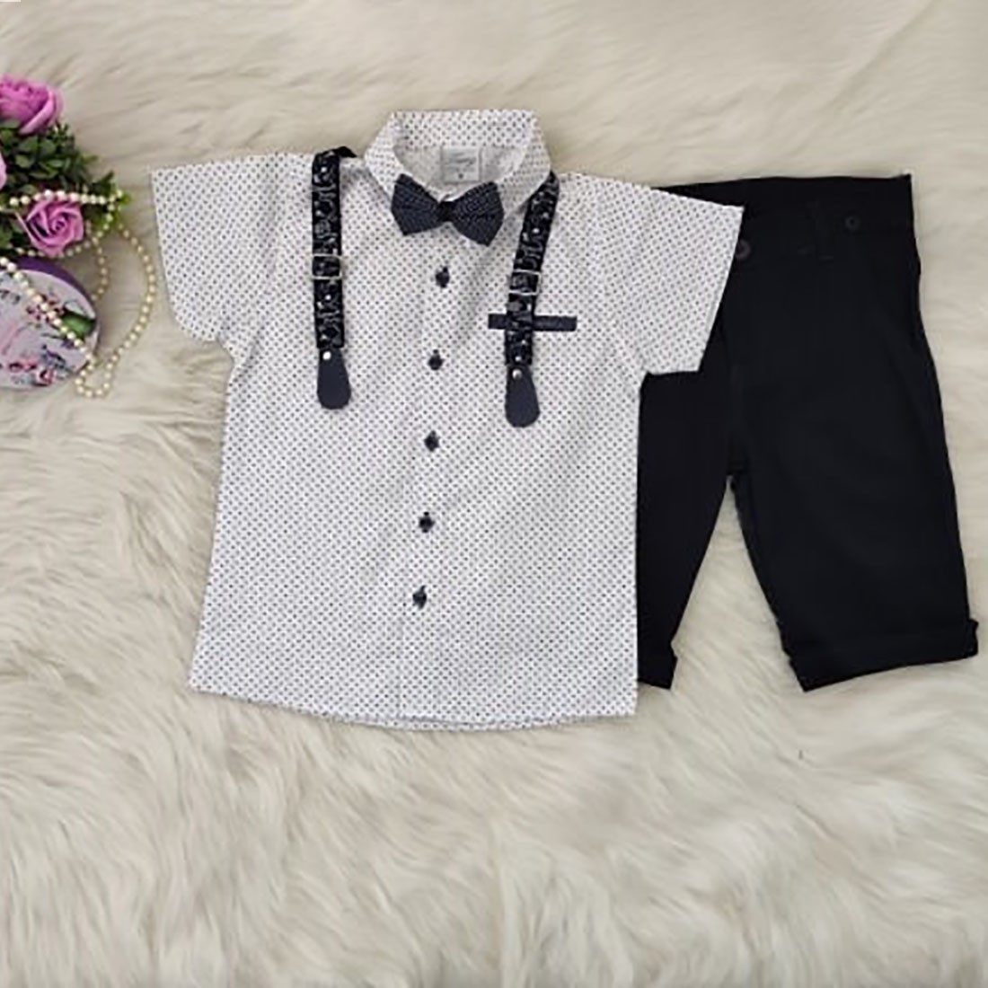 Compleu format din camasa cu maneca scurta , deschisa in nasturi pe partea din fata, , papion cu elastic , vesta , pantalonasi scurti bleomarin elegant model cu buzunare ,bretele separate.