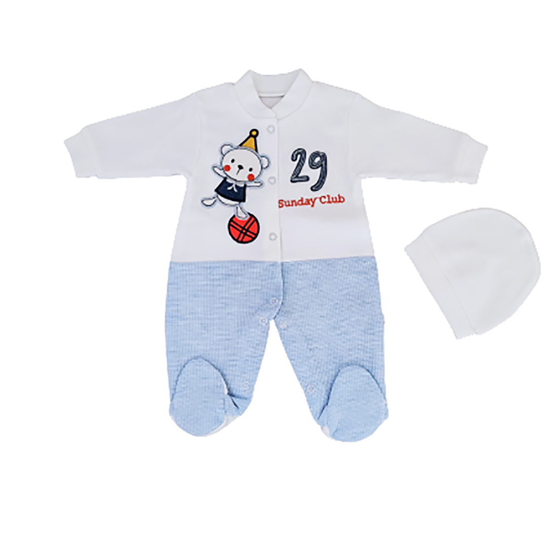 Compleu format din salopeta cu deschidere in fata cu capse si fes . Salopetă cu mânecă lungă fabricată din bumbac moale (100% bumbac) si imprimeu vesel brodat .