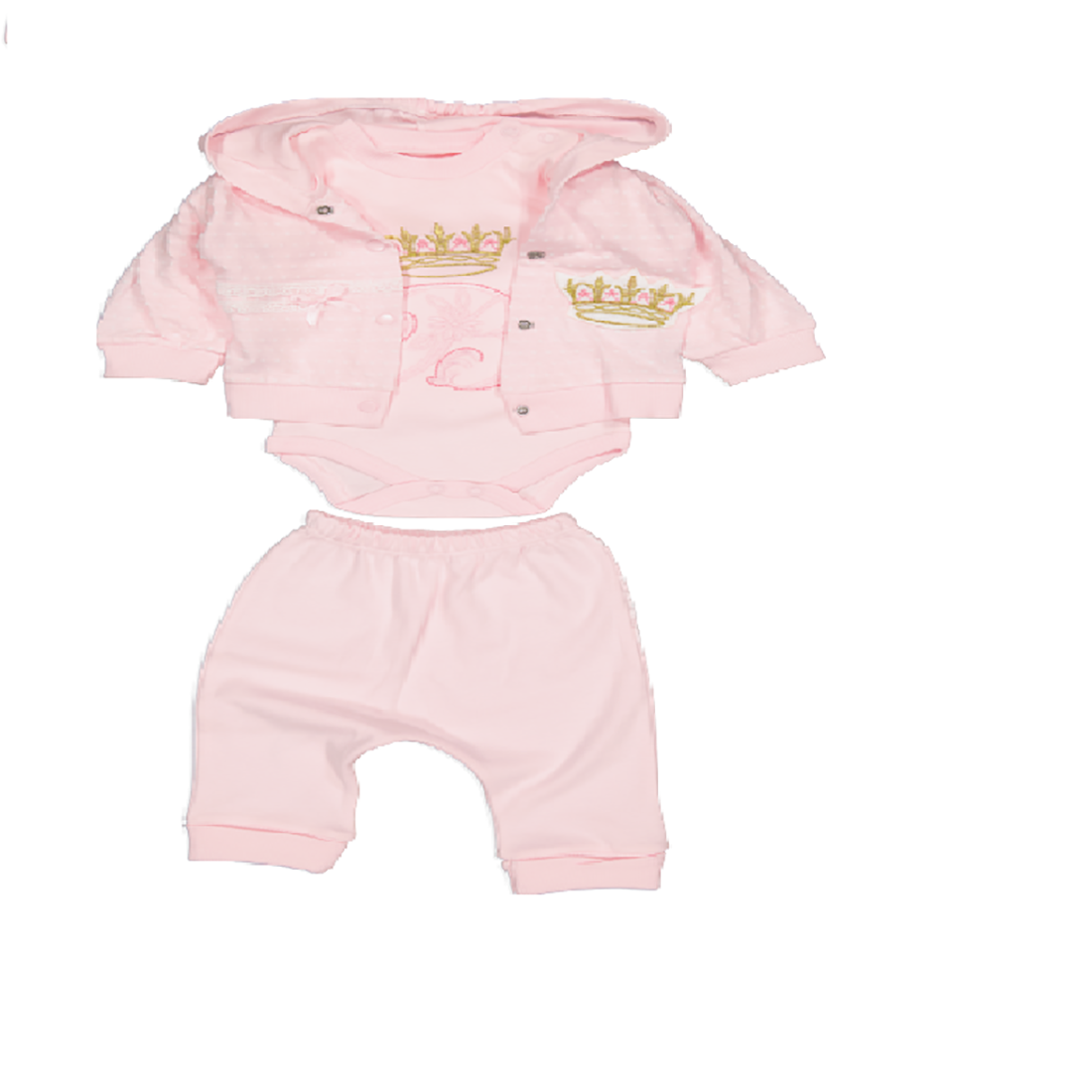 Compleu roz Regal Princess 0-9 luni este un compleu confortabil care poate fi purtat oricand, este din 100% bumbac , sofisticat, pentru bebelusi eleganti, deosebiti, care vor sa fie diferiti de restul, gandit special de echipa BibiStore. Potrivit atunci cand vreti sa iesiti la o plimbare sau la joaca. Comod, calitativ, elegant, colorat. Cu imprimeuri dragalase, cu personaje sau animalutele preferate ale copilasului tau!